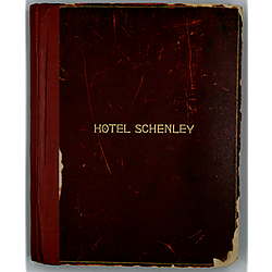 The Hotel Schenley register is a single record volume produced by the American Hotel Register Company of Chicago. The covers of the volume are bound in red leather and "Hotel Schenely" is stamped in embossed gold lettering on the front cover. The end sheets for the volume include maps entitled, "Leahy's Railway Distance Map of the United States." Along the edge of the end sheets are advertisements for various Pittsburgh-area businesses. The advertisements are on leather and also embossed in gold. The first section of the volume consists of the register of guests that logded at the hotel from April 4, 1908 to July 21, 1908 and consists of approximately 150 pages. Recorded on the top of each page is the day of the week and date. The main body of the page is arranged as a table with entries for the name of the hotel guest, their city or place of residence and the room they were assigned while at the Hotel Schenley. Following the register section of the volume is a printed hotel guide consisting of 42 pages entitled, "Leahy's Hotel Guide of America." The guide is organized by state and contains a copyright date of March, 1907.
