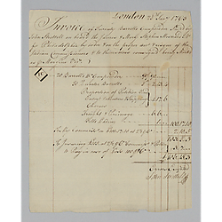 Other receipts dictate the type of service provided such as "advice to the Indian Trade in Pittsburgh." There are also records indicating that provisions of food were taken by agents for the Province in Indian Affairs during expeditions, often explaining the length of the journey and rations for specific individuals. Lastly, the documents provide evidence of the Baynton Company's purchase of "the Commissioners for Indian Affairs, the Goods belonging to this Province, now at Pittsburgh" on March 15, 1765. The Philadelphia Company also known as Baynton, Wharton, and Morgan were simultaneously involved with increasing their trade with the Native Americans while disassociating themselves from English merchants due to legislation restraining colonial trade in the interest of the Crown.