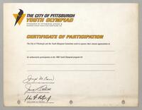 The collection contains original photographs, captions, contact sheets, preservation photocopies, and an assortment of paper ephemera from the 1968 Youth Olympiad in Pittsburgh during June, July, and August of that year. The photos are arranged by the type of sporting event in which the photo was captured. The photos show young children competing in a variety of different sports clinics and competitions across the city. The paper ephemera includes an event pamphlet, contestant sign-up sheet, stationary paper, iron-on decal of the events logo, and a blank participation certificate for participants of the event.