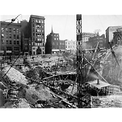 Within this collection of construction photographs, images of well-known buildings are also visible, most notably the Allegheny County Court House, the Carnegie Building, the Frick Building, and Kauffman's Department Store. By March 1916, construction of the Union Arcade Building is visible in the foreground of the nearly completed hotel.