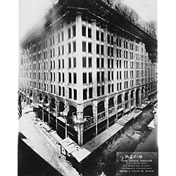 The collection is held by the Archives Service Center (ASC) at the University of Pittsburgh. The Union Arcade Building Photographs contain all 85 views of the construction of this building in Downtown, Pittsburgh taken between June 16, 1915 and October 26, 1916 by the Photo Products Company. The images depict the construction progress of the building and the workers who erected it. The photographs also contain evidence of the impact this building made in the Downtown area by observing the change in the surrounding landscape during this brief time.