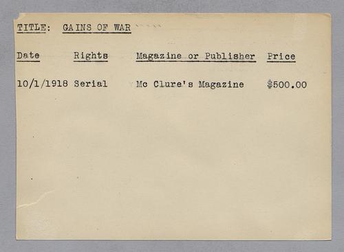 Typescript and handwritten notes on the publication rights associated with multiple works written by Mary Roberts Rinehart. Included are titles beginning with letter(s) "G-R."